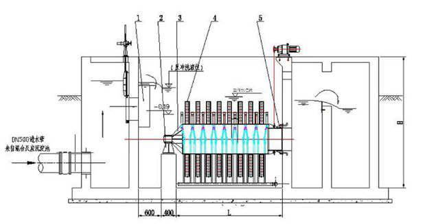 一、纖維轉盤(pán)濾池|纖維轉盤(pán)過(guò)濾器概述 纖維轉盤(pán)濾池|纖維轉盤(pán)過(guò)濾器是我公司自主研發(fā)的一項過(guò)濾技術(shù)。其主要原理是,當污水進(jìn)入反應槽后,轉盤(pán)交替地和空氣與污水相互接觸。在經(jīng)歷過(guò)一段時(shí)間后,在轉盤(pán)上即將附著(zhù)一層棲息著(zhù)大量生物的生物膜,微生物的種屬組成逐漸穩定,其新陳代謝功能也逐步發(fā)揮出來(lái),并逐漸達到穩定的程度,污水中的有機物為生物膜所吸附和降解。 二、纖維轉盤(pán)的過(guò)濾介質(zhì) 纖維轉盤(pán)濾池|纖維轉盤(pán)過(guò)濾器的過(guò)濾質(zhì)是纖維毛濾布,它的主要成分是有機纖維堆,其絨毛表面由50%超細聚酯纖維和50%改性丙烯晴纖維堆組成,同時(shí)以聚酯纖維作為支撐體。在干燥狀態(tài)下,纖維毛呈直立狀態(tài),浸濕后纖維毛便會(huì )耷拉下來(lái),形成濾布介質(zhì)有3-5mm的有效過(guò)濾深度,且當量孔徑只有10μm ,可以使固體粒子在有效過(guò)濾厚度中與過(guò)濾介質(zhì)充分接觸,在反沖洗狀態(tài)下,與反抽裝置相靠近的纖維毛又會(huì )直立起來(lái),方便纖維毛中的雜質(zhì)排出,可以徹底清洗。纖維毛在各種狀態(tài)下的情況如圖所示: 三、纖維轉盤(pán)濾池|纖維轉盤(pán)過(guò)濾器的結構 纖維轉盤(pán)濾池|纖維轉盤(pán)過(guò)濾器結構如下圖所示,它由用于支撐濾布的垂直安裝于中央集水管的平行過(guò)濾轉盤(pán)串聯(lián)起來(lái)組成。一套裝置過(guò)濾轉盤(pán)數量-般為2-20個(gè) ,每個(gè)過(guò)濾轉盤(pán)是由6個(gè)小塊扇形組合而成。過(guò)濾轉盤(pán)由防腐材料組成, 每片過(guò)濾轉盤(pán)外包有纖維毛濾布。反沖洗裝置反抽吸裝置及閥門(mén)組成。排泥裝置由排泥管、排泥泵及閥門(mén)]組成,排泥泵與反洗水泵為同一泵。 四、纖維轉盤(pán)濾池|纖維轉盤(pán)過(guò)濾器的運行 纖維轉盤(pán)濾池|纖維轉盤(pán)過(guò)濾器的運行狀態(tài)包括:過(guò)濾、反沖洗、排泥狀態(tài)。 (1)過(guò)濾:外進(jìn)內出,污水重力流進(jìn)入濾機體,使濾盤(pán)全部浸沒(méi)在污水中。同時(shí)為了使各處布水均勻并且使進(jìn)水量產(chǎn)生低擾動(dòng),須在濾機中設布水堰。污水通過(guò)濾布過(guò)濾,過(guò)濾液通過(guò)中空管收集后, 流入出水槽、堰排出濾機。整個(gè)運行過(guò)程中過(guò)濾均為連續的,即便在清洗過(guò)程中,過(guò)濾仍在進(jìn)行。 (2)清洗:過(guò)濾中部分污泥吸附于纖維毛濾布中,逐漸成為污泥層。隨著(zhù)濾布上污泥的積聚,濾布過(guò)濾阻力增加, 濾池水位逐漸升高。通過(guò)設置在濾池內的液位傳感器監測池內的液位變化,當該池內液位到達清洗設定值時(shí)(高水位),控制盤(pán)即啟動(dòng)反沖洗泵,同時(shí)啟動(dòng)濾盤(pán)旋轉,開(kāi)始清洗過(guò)程。反洗時(shí)間和周期可以調整。 (3)排泥:纖維轉盤(pán)濾池|纖維轉盤(pán)過(guò)濾器轉盤(pán)下設有斗型池底,有利于池底污泥收集。池底污泥沉積減少了濾布上的污泥量,可延長(cháng)過(guò)濾時(shí)間,減少反沖洗水量。經(jīng)過(guò)一設定的時(shí)間段,控制盤(pán)啟動(dòng)排泥泵,通過(guò)池底穿孔排泥管、閥、泵將污泥排至污泥系統。其中,排泥間隔時(shí)間及排泥歷時(shí)可以調整。 五、纖維轉盤(pán)濾池|纖維轉盤(pán)過(guò)濾器的獨特設計和優(yōu)點(diǎn): (1)出水水質(zhì)好,耐沖擊負荷高; 纖維轉盤(pán)濾池|纖維轉盤(pán)過(guò)濾器截留效果好,在進(jìn)水SS不大于20mg/l時(shí),出水SS可以小于5mg/l。 (2)占地面積; 與傳統的深層過(guò)濾單元不同的是:傳統過(guò)濾設備內水流一般從上至下,或從下至上,屬于平面方向過(guò)濾,纖維轉盤(pán)過(guò)濾器則將過(guò)濾面豎直起來(lái),水流從左至右流動(dòng),因此很多過(guò)濾面可以并排布置,可以在保證過(guò)濾面積足夠大的前提下減少占地面積。另外,設備簡(jiǎn)單緊湊,附屬設備少,根據布置情況,附屬設備只需占用少量地方。 (3)設備閑置率低,總裝功率低; 所有濾盤(pán)幾乎總處于過(guò)濾狀態(tài),設備閑置率低。整個(gè)過(guò)濾裝置需要用電的只有驅動(dòng)電機、反洗水泵和電動(dòng)閥,驅動(dòng)電機功率僅為0.55KW-0.75KW,反洗水泵功率僅為2.2KW,總裝機功率很低 (4)反沖洗量水少,對前面處理工藝影響; 纖維轉盤(pán)過(guò)濾器所需要的水量小,與處理水量的比為≤1%。實(shí)際工程運行情況下,反沖洗間隔時(shí)間一般為2h,每個(gè)濾盤(pán)的沖洗時(shí)間為1-2mim。因此,反洗水量可以比較均勻地返回到處理前處理系統,不會(huì )對前處理工藝產(chǎn)生影響。 (5)清洗徹底,無(wú)需預加氯; 濾布結構為大孔隙支撐層及纖維毛層,反抽吸時(shí),在反抽吸口處纖維毛會(huì )完全直立起來(lái),清洗比較徹底,殘留很難積累。 (6 )運行自動(dòng)化; 整個(gè)過(guò)程用計算機控制,可根據液位或時(shí)間來(lái)控制反沖洗過(guò)程及排泥過(guò)程的時(shí)間間隔及過(guò)程歷時(shí)。 ( 7 )維護簡(jiǎn)單方便; 纖維轉盤(pán)濾池|纖維轉盤(pán)過(guò)濾器只有反沖洗或排泥時(shí),泵或電機才運轉。濾布磨損較小,即使有異常損壞,濾盤(pán)也易于更換,濾盤(pán)的每個(gè)扇形片均可以單獨移開(kāi),更換一個(gè)盤(pán)片僅需10min。 六、