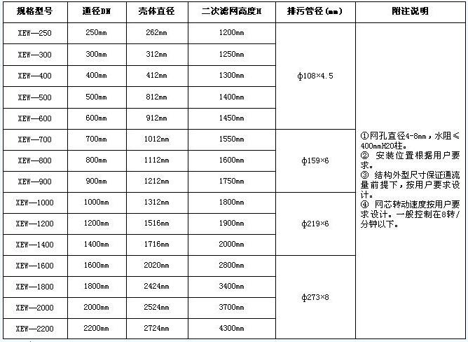 規格型號  通徑DN  殼體直徑  二次濾網(wǎng)高度H  排污管徑(mm) 附注說(shuō)明