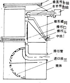 當排污半停上在某.位置時(shí),由于該斗的兩側橡皮隔板與濾網(wǎng)相抵,此時(shí)斗內壓力小于網(wǎng)后的水壓力·水即由濾網(wǎng)上涌人斗內,吸附在網(wǎng)前的污物經(jīng)過(guò)斗與空心直軸內側的排污口進(jìn)入排污管流出筒體。
