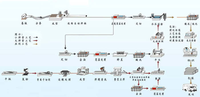 公司擁有國內先進(jìn)制管流水線(xiàn)6條。從分條開(kāi)卷、清洗脫脂、緄軋成型、焊接、打磨、定徑、在線(xiàn)固熔、渦流探傷、標志噴碼、定尺檢驗、氣密性試驗、檢驗包裝,都嚴格按照GB/T12771-2000《流體輸送用不銹鋼焊接鋼管》、ASTM A249/A249M-96a《鍋爐、過(guò)熱器、熱交換器及冷凝器用奧氏體焊接鋼管》、SA-249/SA-249M《鍋爐、過(guò)熱器、換熱器和冷凝器用焊接奧氏體鋼管子》執行。公司專(zhuān)業(yè)生產(chǎn)的管徑12mm-76mm,壁厚0.2mm-3.0mm的不銹鋼氬弧焊管,廣泛用于電力、化工、機械等行業(yè);特別對電力行業(yè)的凝汽器改造用的高效不銹鋼管的生產(chǎn)、安裝有著(zhù)豐富的經(jīng)驗和能力。
